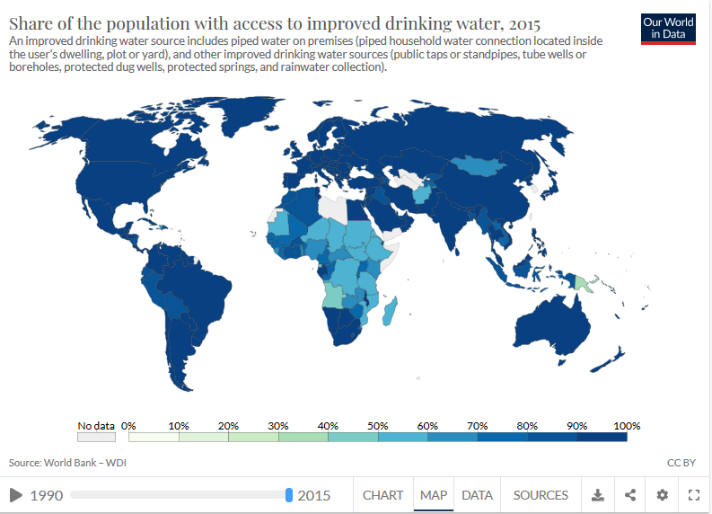 - A livello globale, la percentuale di popolazione che utilizza servizi di acqua potabile gestiti in modo sicuro è aumentata dal 61 al 71% tra il 2000 e il 2015 ed è rimasta invariata nel 2017. Un ulteriore 19% della popolazione mondiale ha utilizzato servizi di base di acqua potabile. Ciò significa che a 785 milioni di persone mancava ancora anche un semplice servizio di acqua potabile.