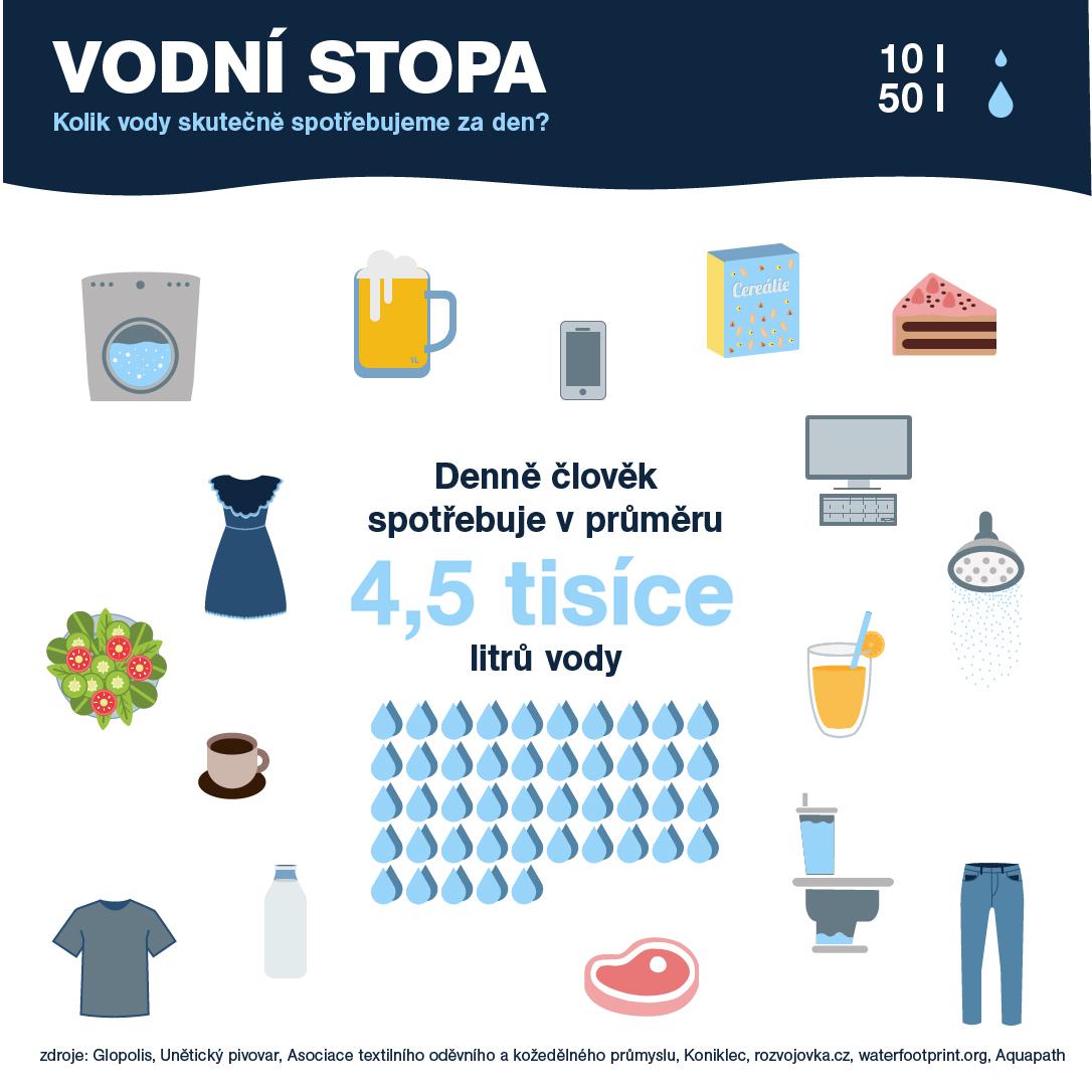 Vodní stopa ukazuje množství použité vody ve vztahu ke spotřebě.